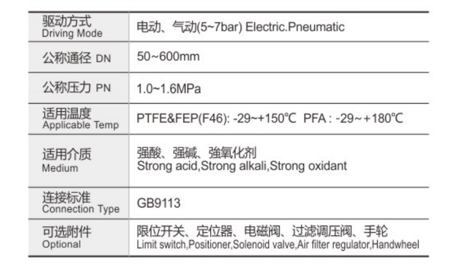 D671F四氟密封氣動對夾式蝶閥采用帶有球形密封表面的襯氟塑料包襯蝶板或不銹鋼板,配以閥座基部的硅橡膠襯墊調節閥門的密封性能;該閥門操作輕便,嚴密的密封性能,超長的使用壽命;可作快速切斷或調節流量之用。適用于要求可靠密封和良好調節特性的場合。閥體采用分體式,閥軸現端的密封由蝶板與閥座之間的旋轉基面加氟橡膠來控制, 從而達到產品結構緊湊、外形美觀、工藝合理、性能可靠。切斷閥保證閥軸不與腔內流體介質接觸,更換閥軸時非常方便,閥門不需要拆離離管道即可完成。產品廣泛適用于各種不同類型工業管道中液體和氣體(包括蒸氣)的輸送,特別是具有嚴懲腐蝕性介質的使用場合如硫酸、氫氟酸、磷、酸、氯氣、強堿,王水等具有強腐蝕的介質。